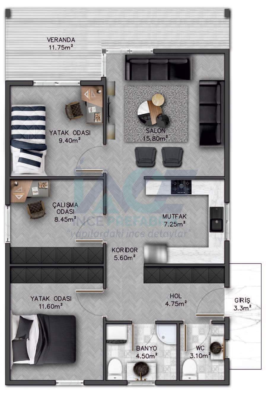 IC602 86m² 3+1 Tek Katlı Çelik Ev