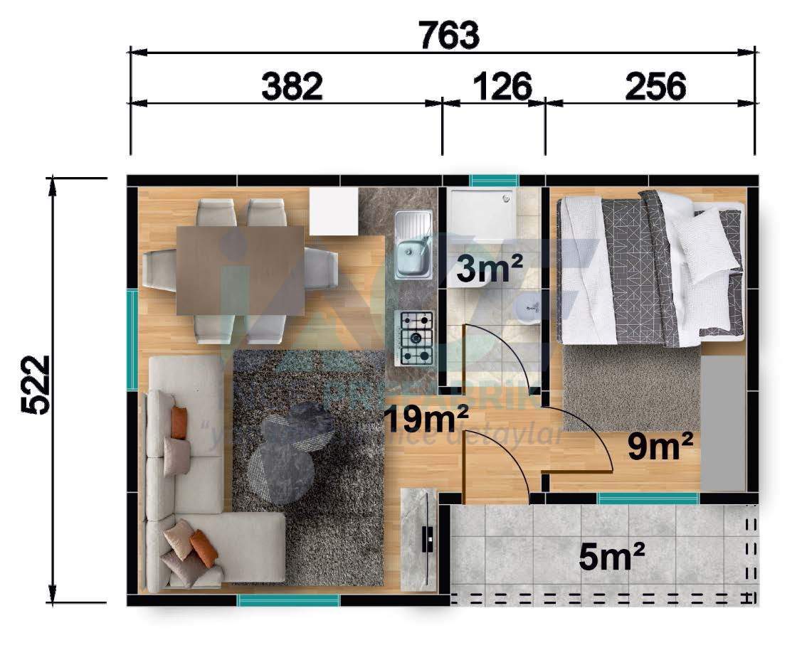IP100 40m² 1+1 Tek Katlı Prefabrik